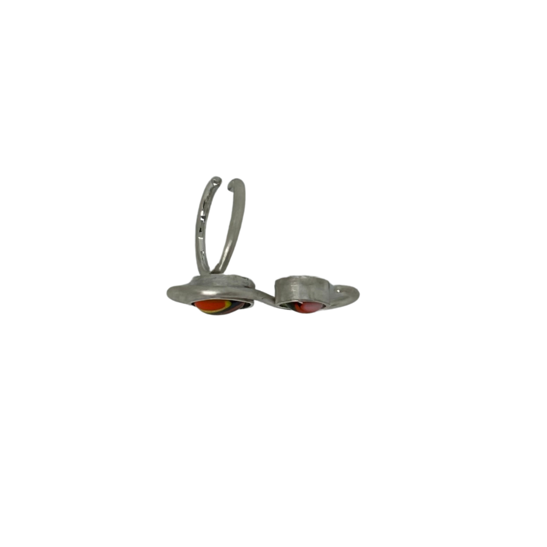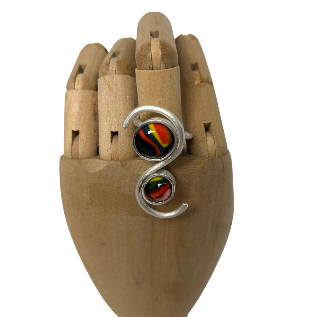 Anel de prata ajustável, com fios de vidro em várias cores.