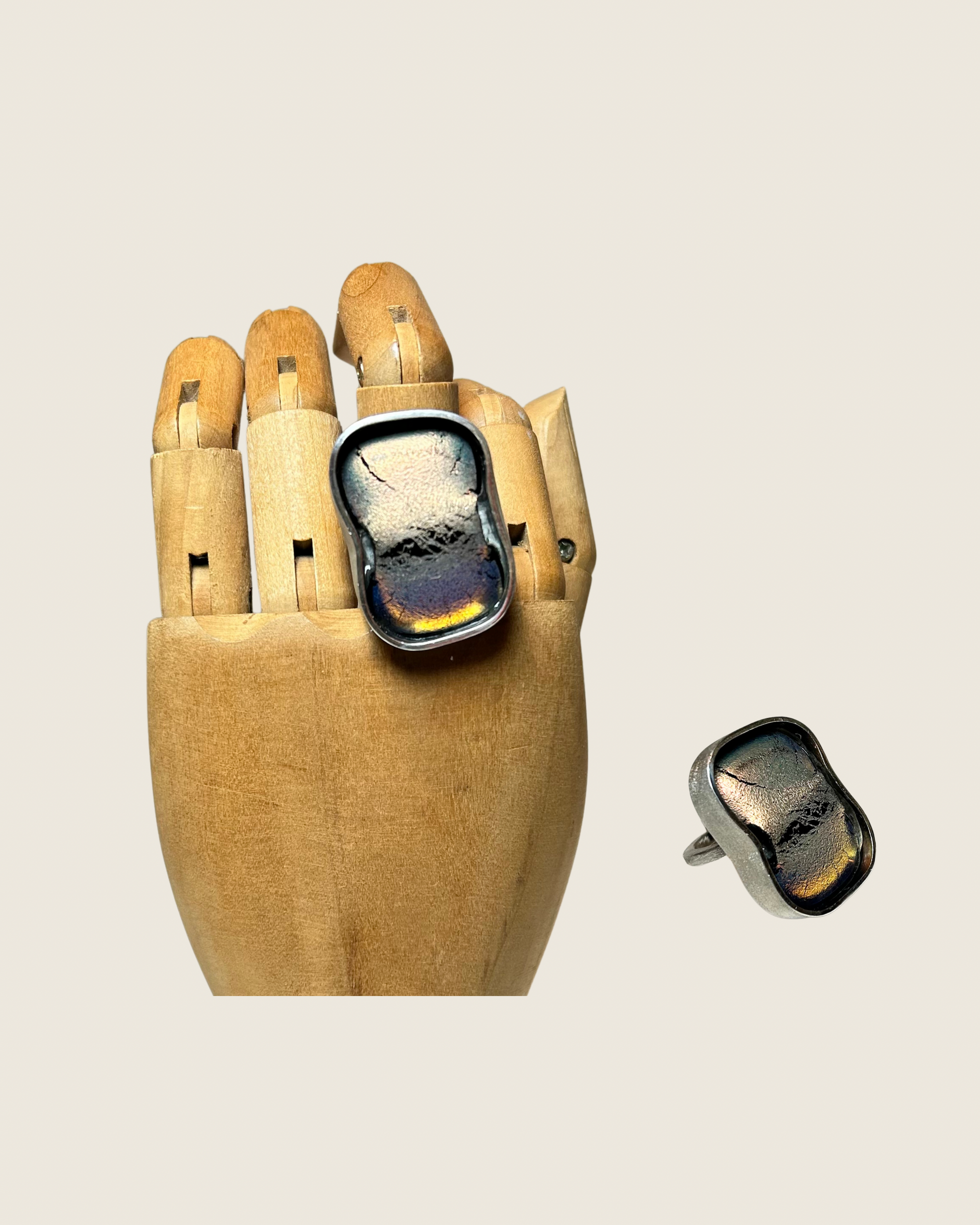 Anel de prata, ajustável, com vidro metalizado.