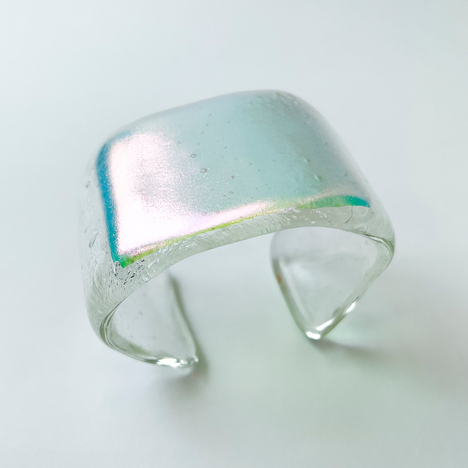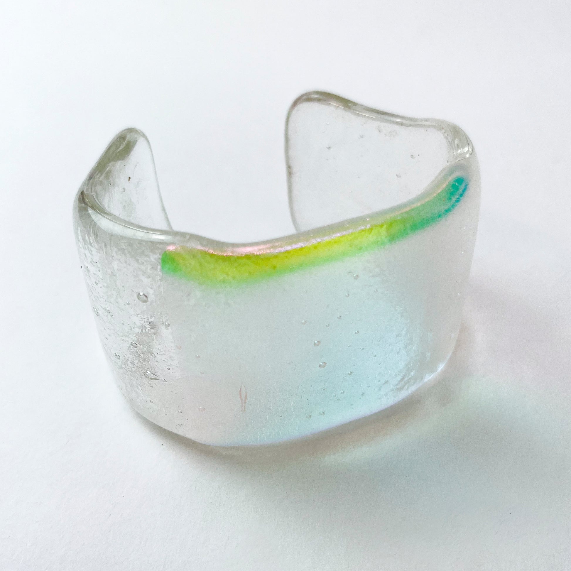 Bracelete de vidro transparente com detalhe em vidro metalizado.