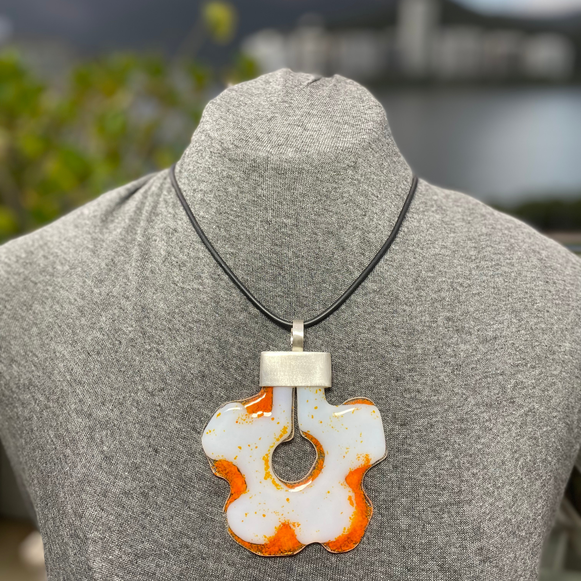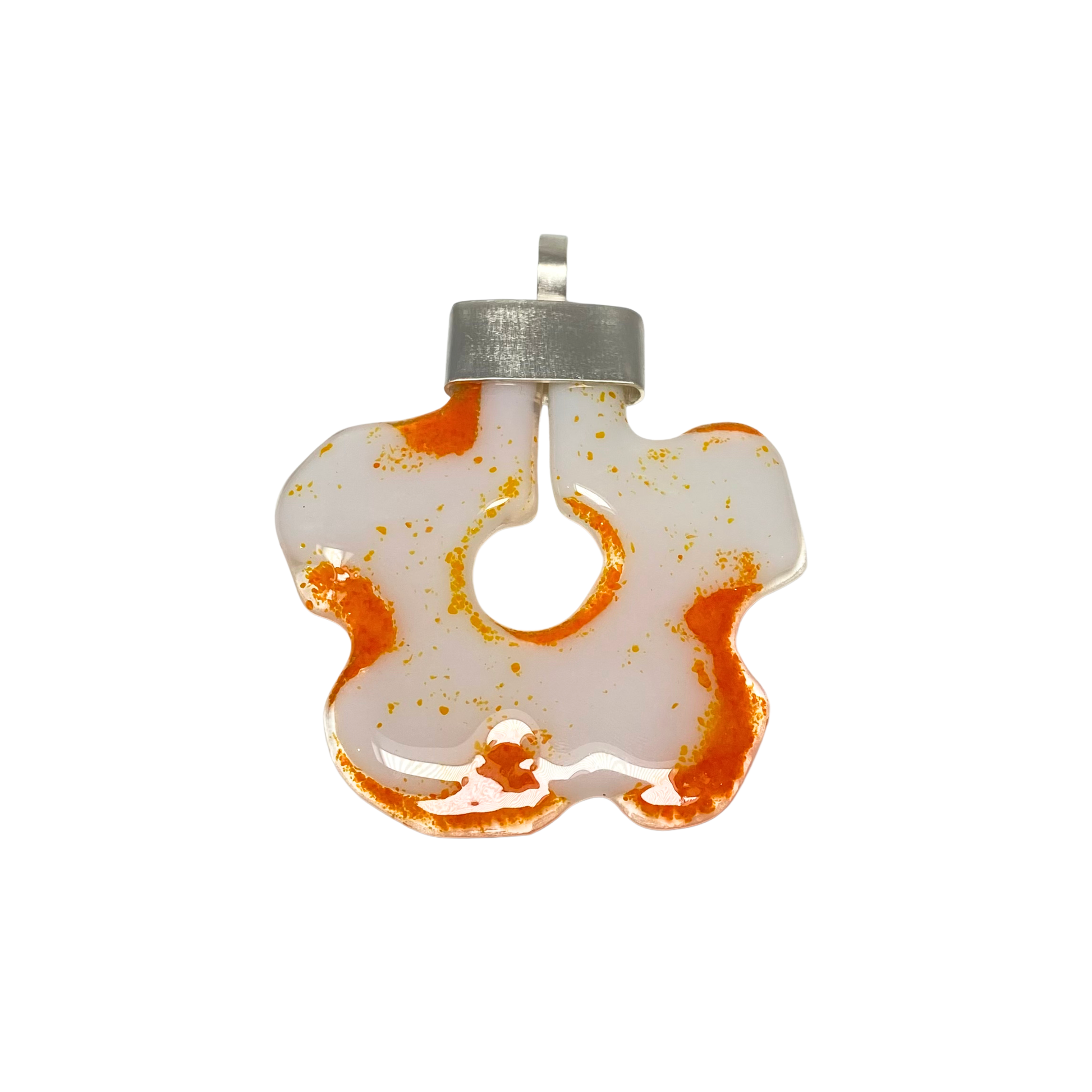 Pingente em vidro branco em forma de flor com detalhe em cristais de vidro, acabamento em prata e cordão de borracha.