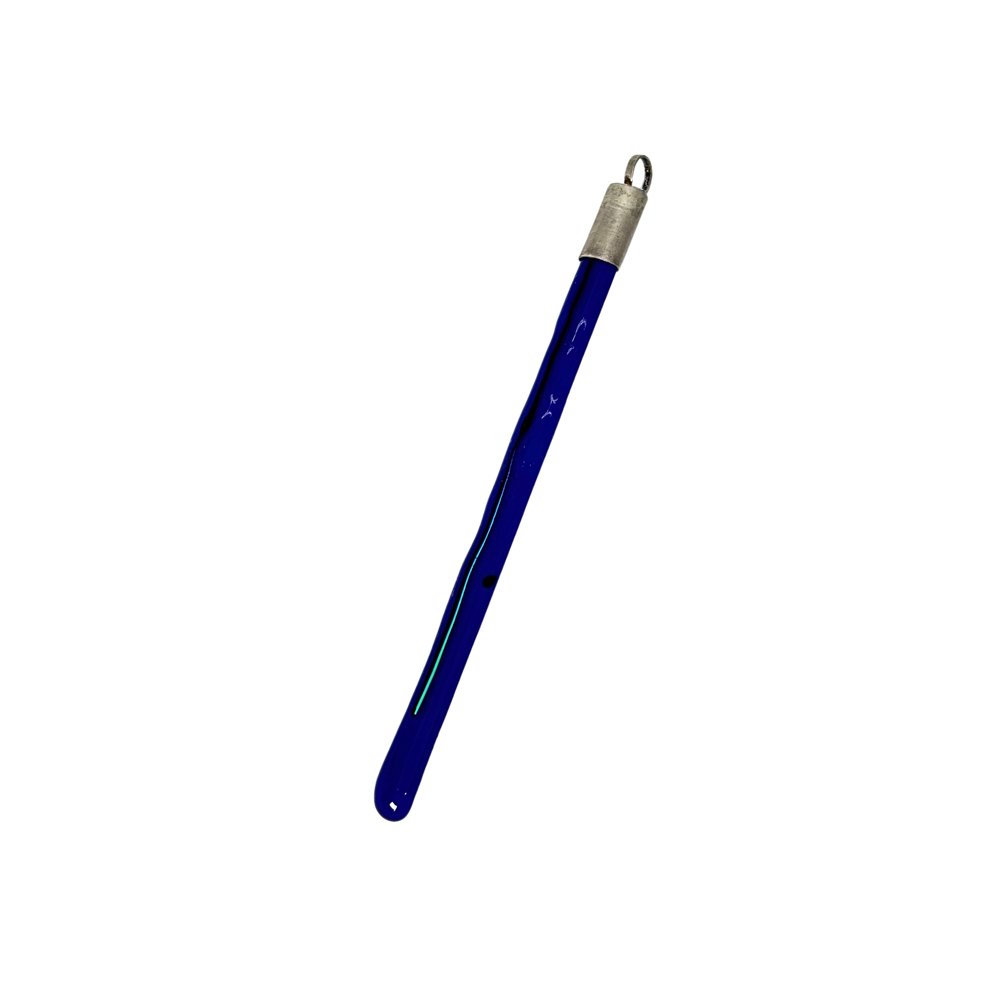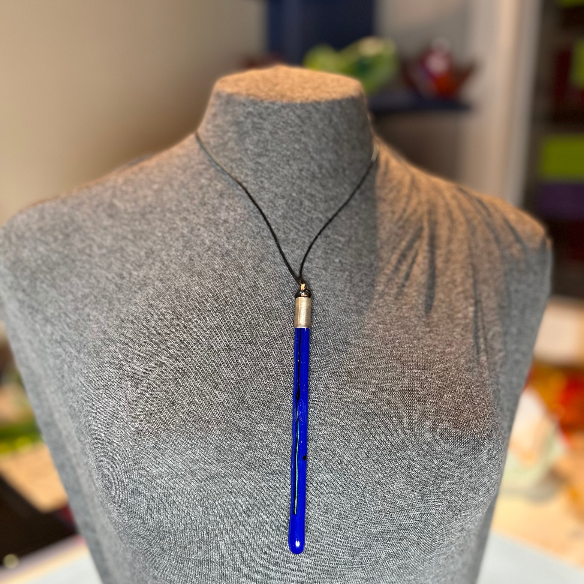 Pingente de vidro azul com detalhe em fio de vidro metalizado, ponteira de prata, cordão de couro e ajuste de metal.