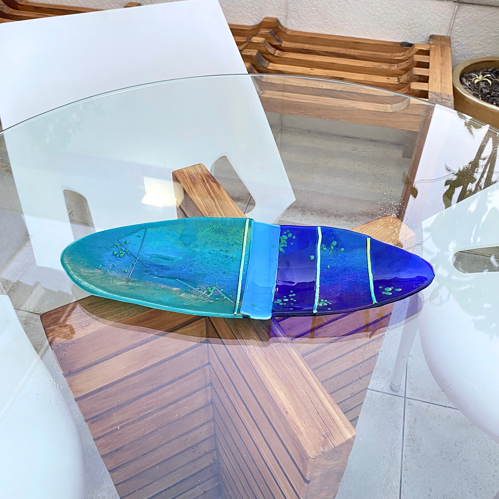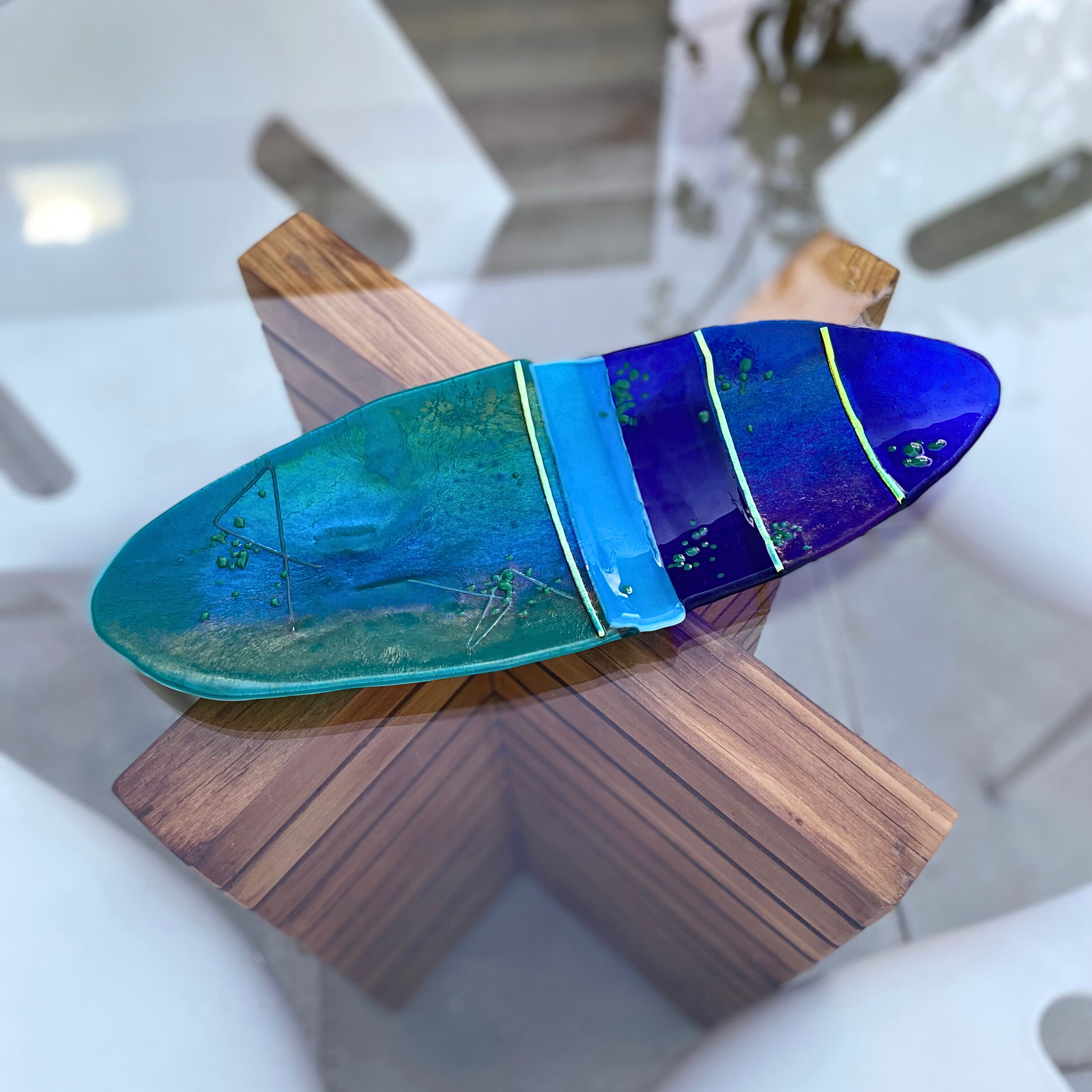 Placa Oval de vidros azuis e verde com detalhes em fios e cristais de vidros coloridos e metalizados.