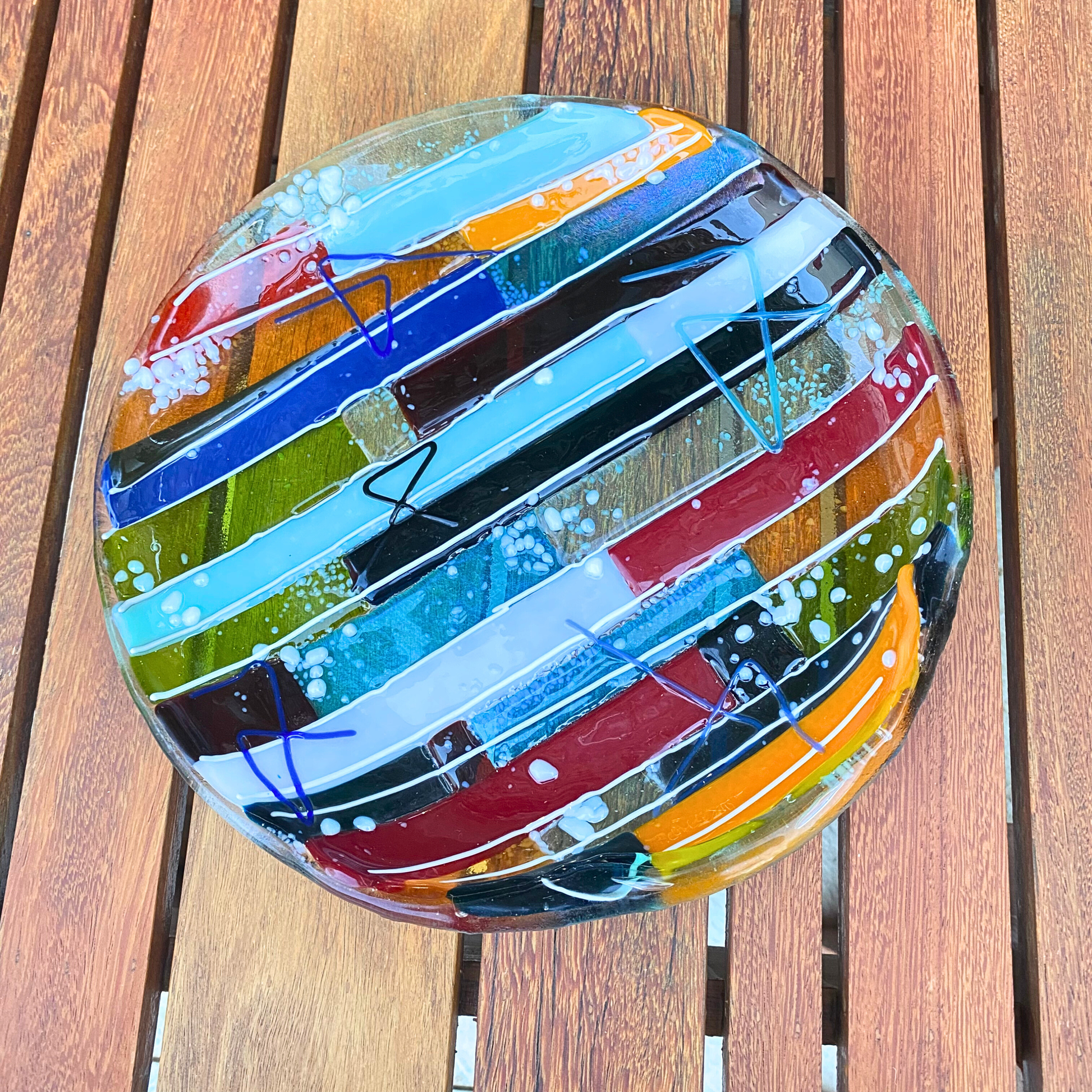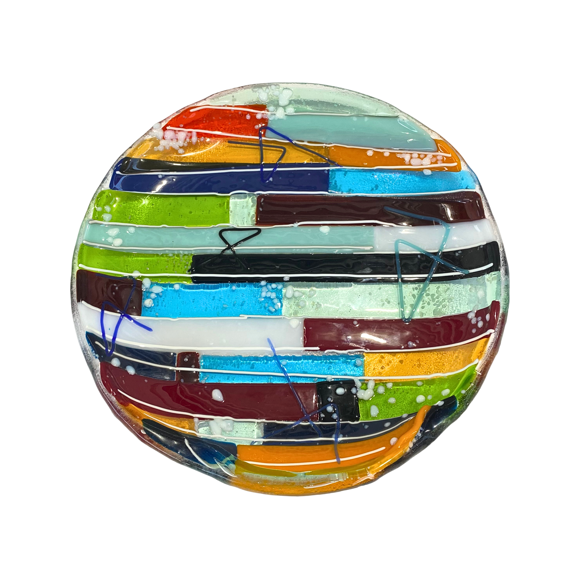 Prato de vidros coloridos com detalhes em fios e cristais de vidro em várias cores.
