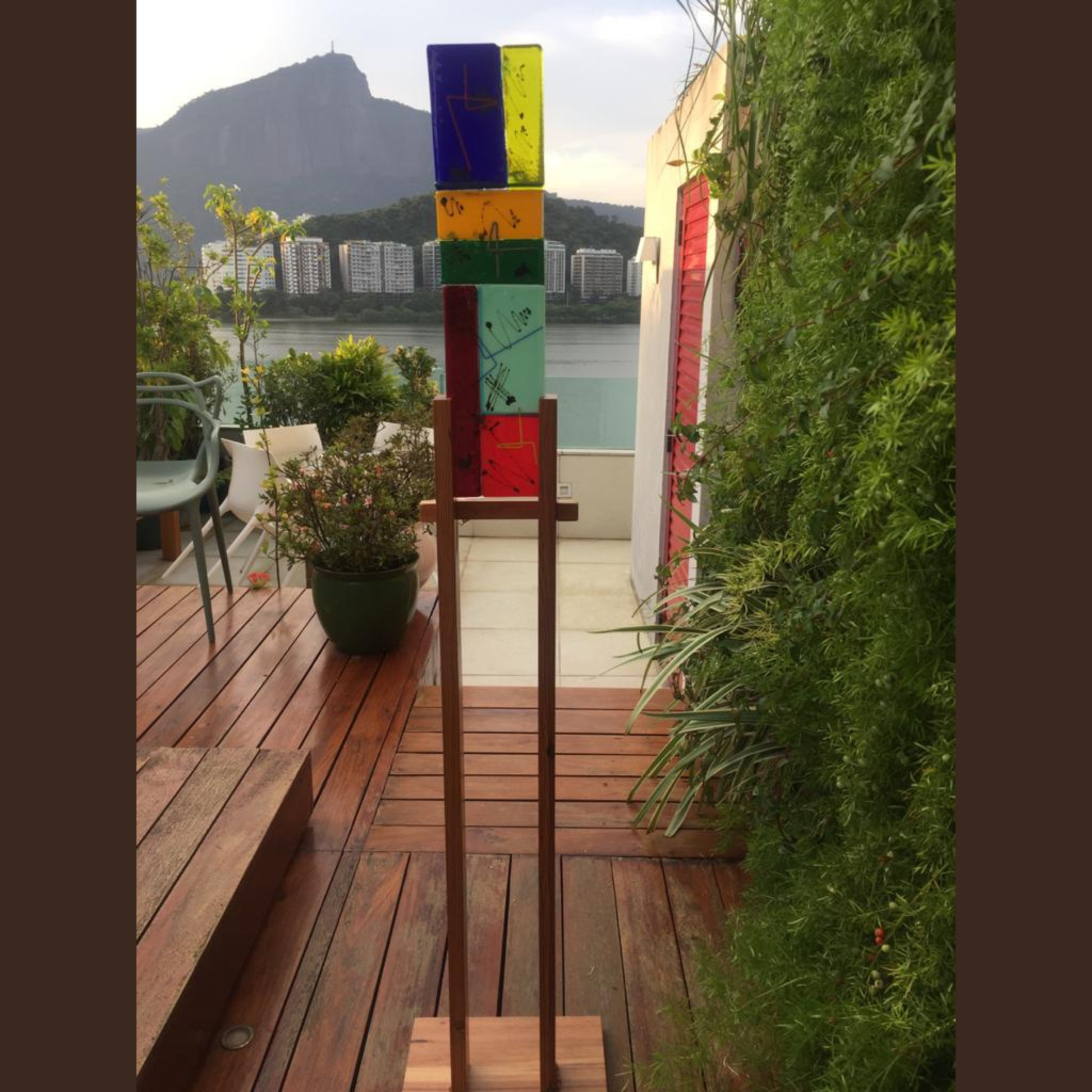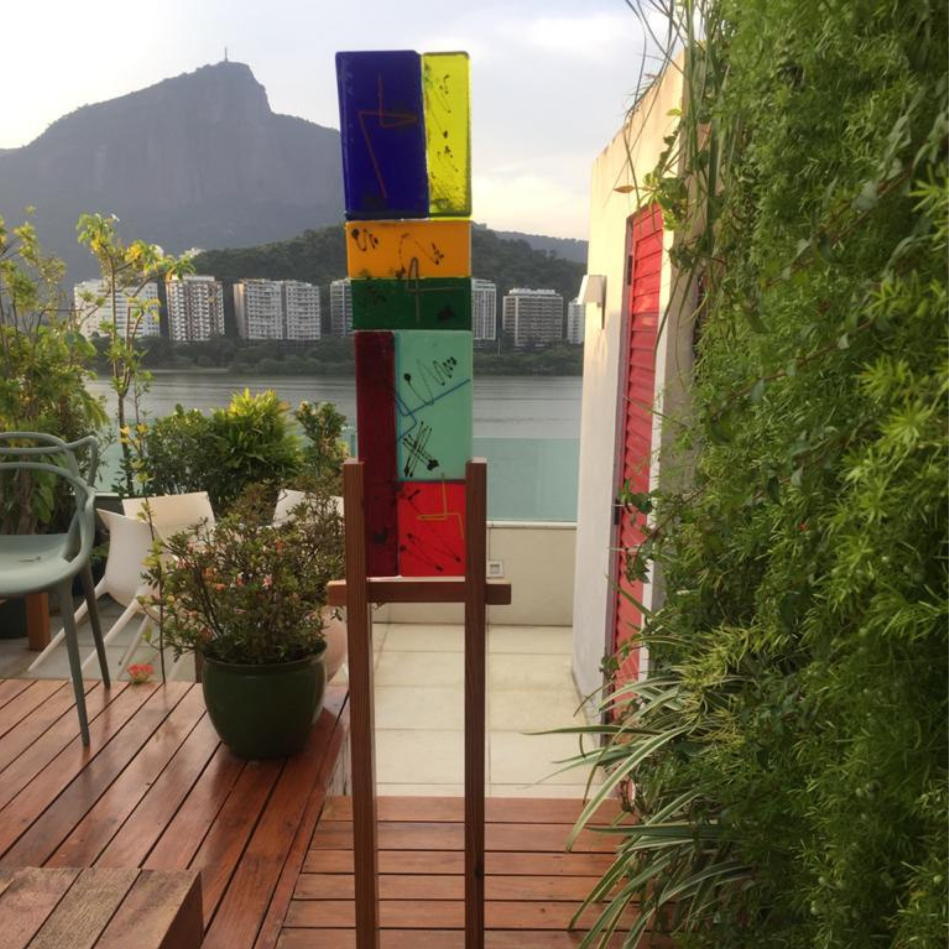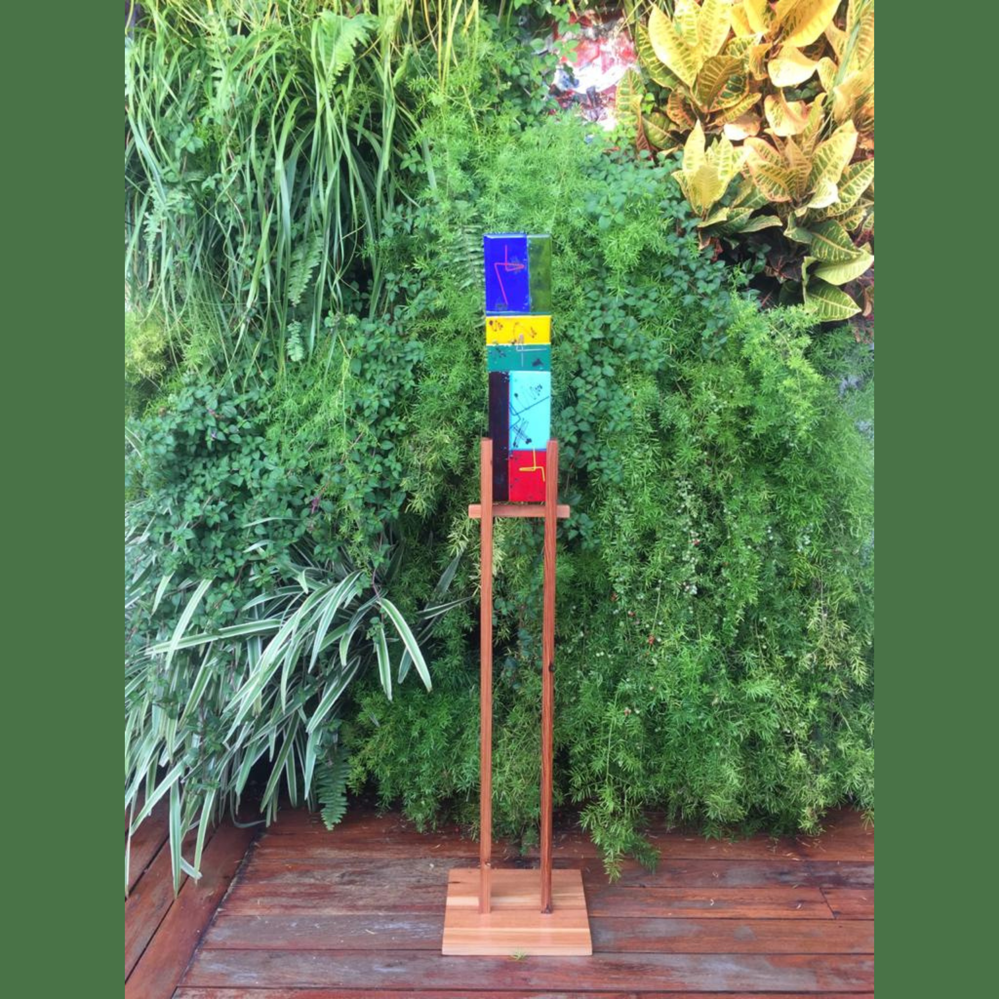 Tóten de madeira com placa de vidro em várias cores e espessuras.