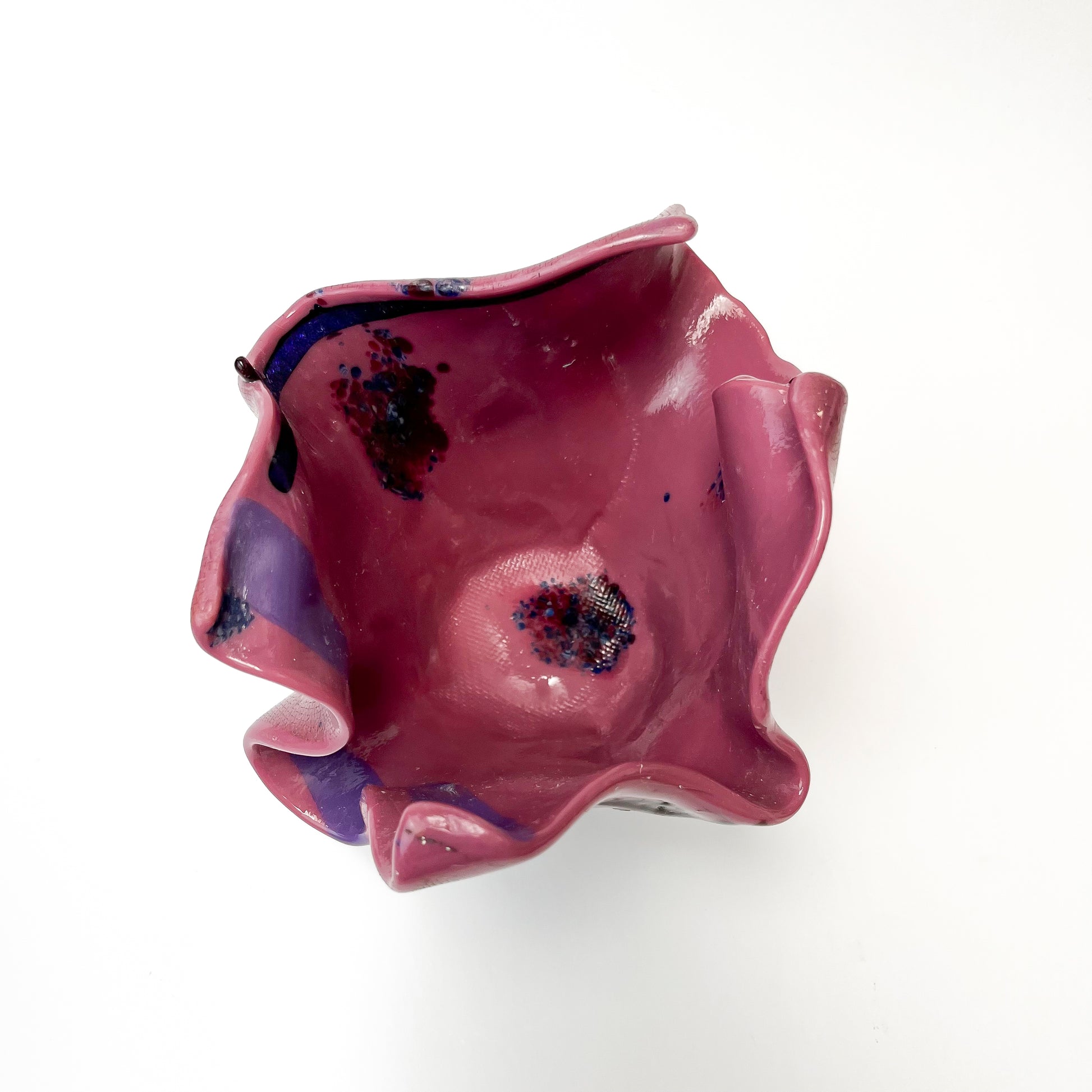 Vaso de vidro rosa com detalhes em vidros coloridos.
